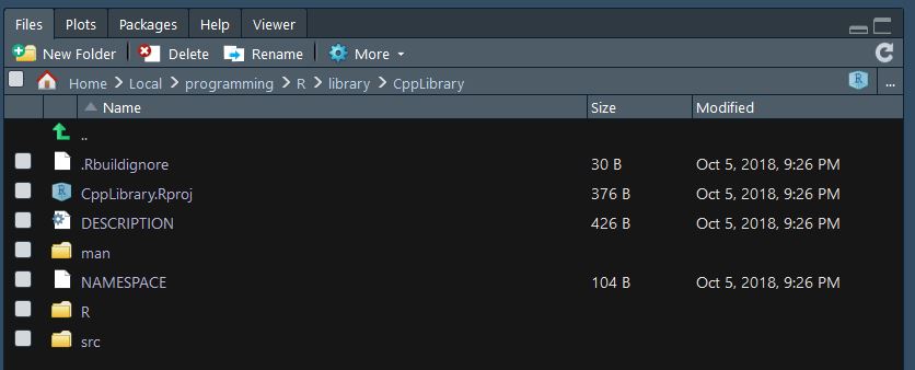 Install and Restart in the Build tab.R/hello.R and src/rcpp_hello.cpp as well as everything in the man subfolder. We will add our own sources soon.Makevars with the following content to the package’s src folder.